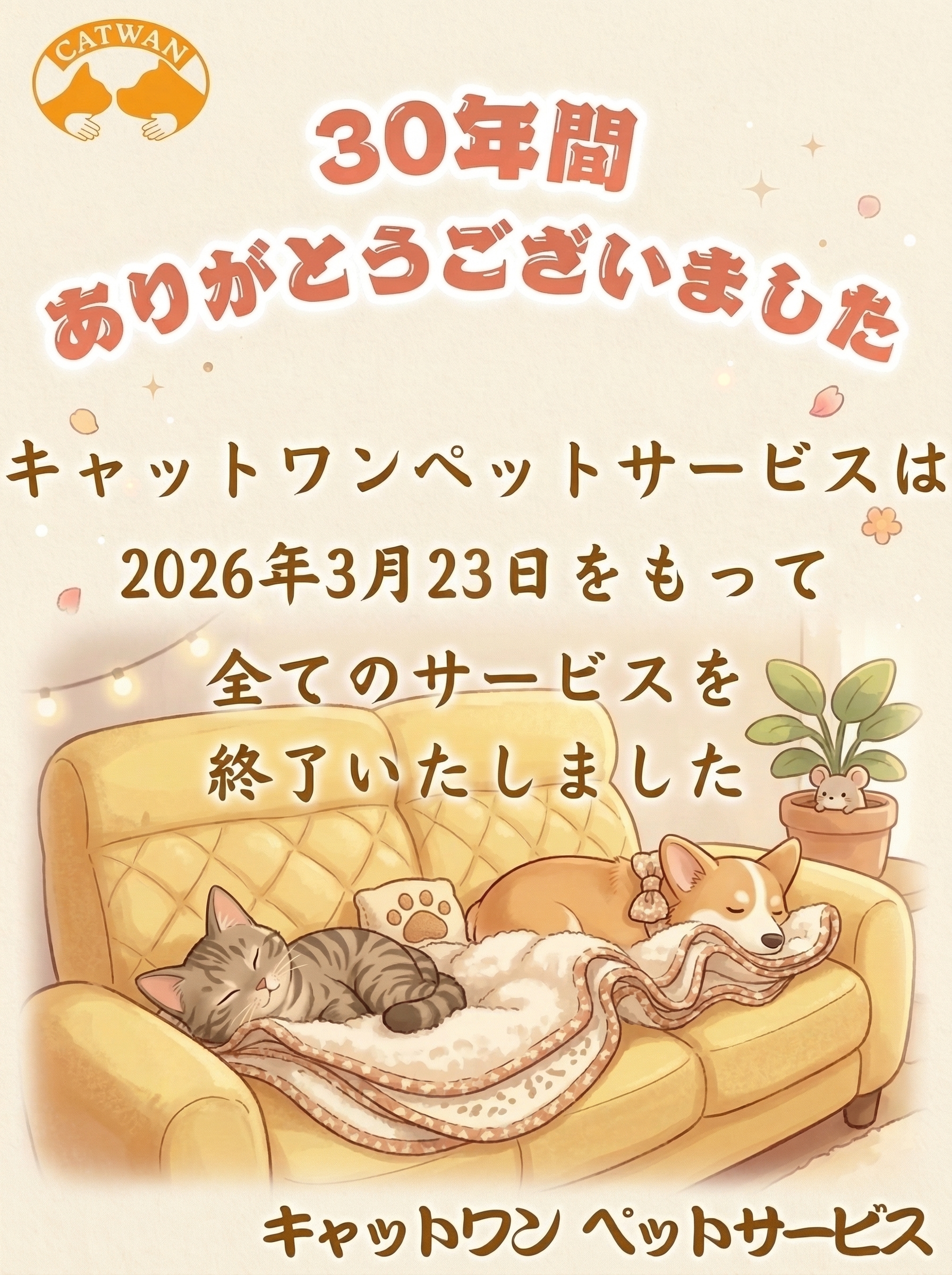 2026年3月23日をもちまして、キャットワンペットサービスは全てのサービスを終了いたしました。 サービス終了のお知らせを発表してから、本当にたくさんのお客様から温かいお言葉や、別れを惜しむお声をいただきました。 30年 …